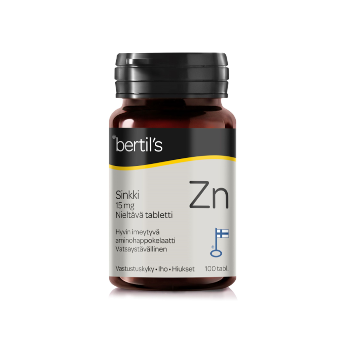 Kotimaiset bertil’s Sinkki -tabletit sisältävät aminohappokelatoitua sinkkiä. Sinkki on tärkeä hivenaine elimistön kaikissa rakennus- ja uudistumistoiminnoissa. Sen vaikutukset näkyvät parhaiten nopeasti uudistuvien kudosten kuten ihon, hiusten ja kynsien hyvinvoinnissa. Sinkkiä tarvitaan lisäksi vastustuskyvyn ylläpitoon, hedelmällisyyden ja testosteronitasojen tukemiseen sekä mm. aivoille tärkeiden omega-3-rasvahappojen rakentamiseen.