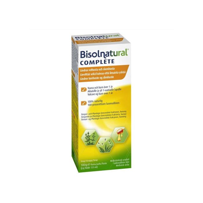 Bisolnatural Complete lievittää sekä kuivaa että limaista yskää. Bisolnatural Complete sopii aikuisille ja yli 1-vuotiaille lapsille.