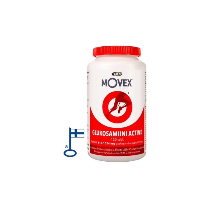 Movex Glukosamiini Active on yhdistelmävalmiste nivelten hyvinvointiin*. Sisältää glukosamiinin lisäksi kondroitiinisulfaattia, MSM:ää ja C-vitamiinia.  Avainlippu-tuote. *C-vitamiini edistää normaalia kollageenin muodostumista rustojen normaalia toimintaa varten.