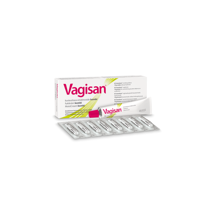 Vagisan Kombi yhdistelmäpakkaus emättimen kuivuuteen: Cremolum® -emätinpuikot ja kosteuttava Vagisan® emätinvoide emättimen ja ulkoisen intiimialueen kuivuuteen. Lievittää emättimen kuivuudesta johtuvia oireita (kuivuuden tunne, kirvely, kutina, pienet haavaumat ja kivut sukupuoliyhteydessä) – täysin ilman hormoneja.